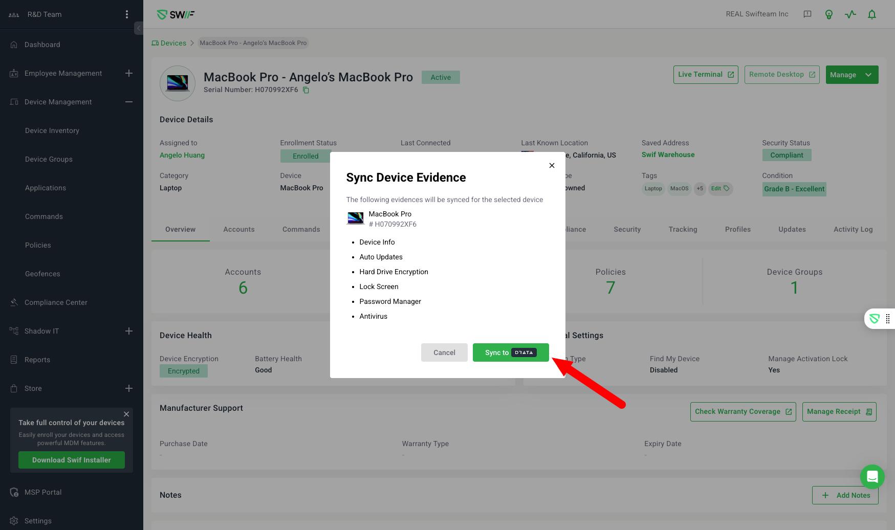 Purpose: Adds an on-demand "Re-sync" option for devices integrated with Drata, allowing users to force a full evidence sync for compliance purposes.