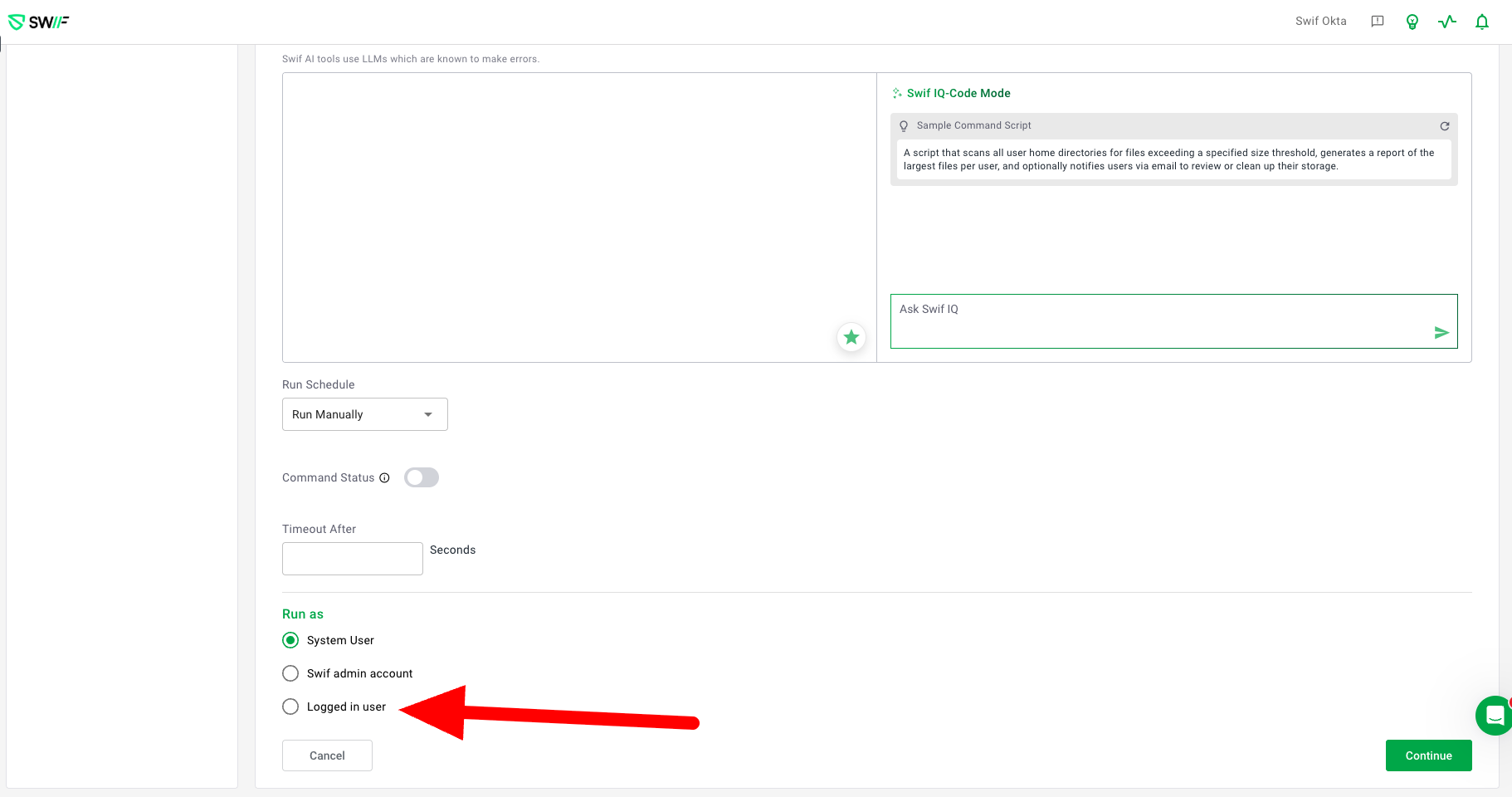 Mutual exclusivity: Users can select either “Run as System user”, "Run on Swif Admin account," or "Run as logged-in user," but not more than one option at the same time.