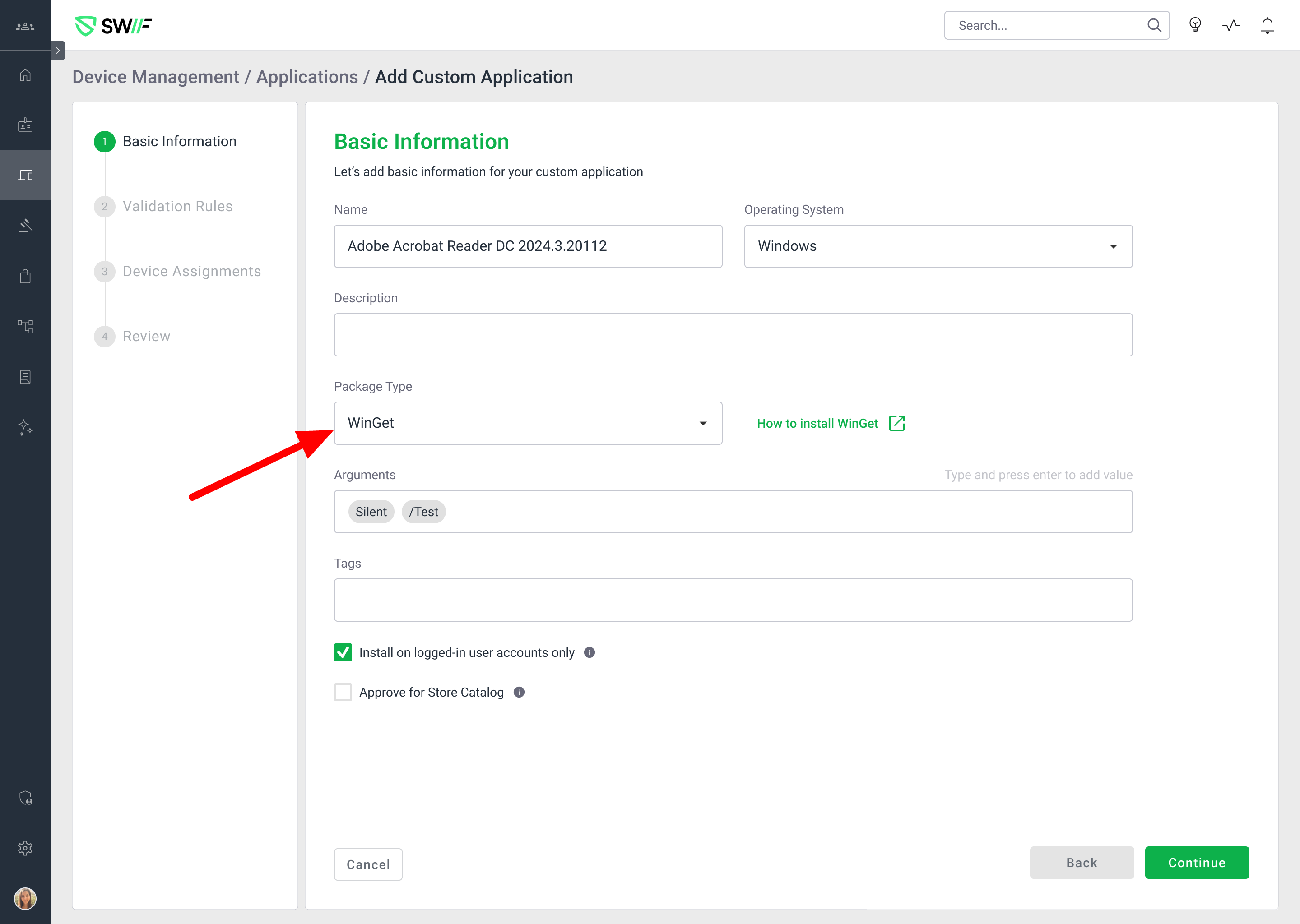 The key feature allows users to choose Winget for Software installation on Windows devices or groups.