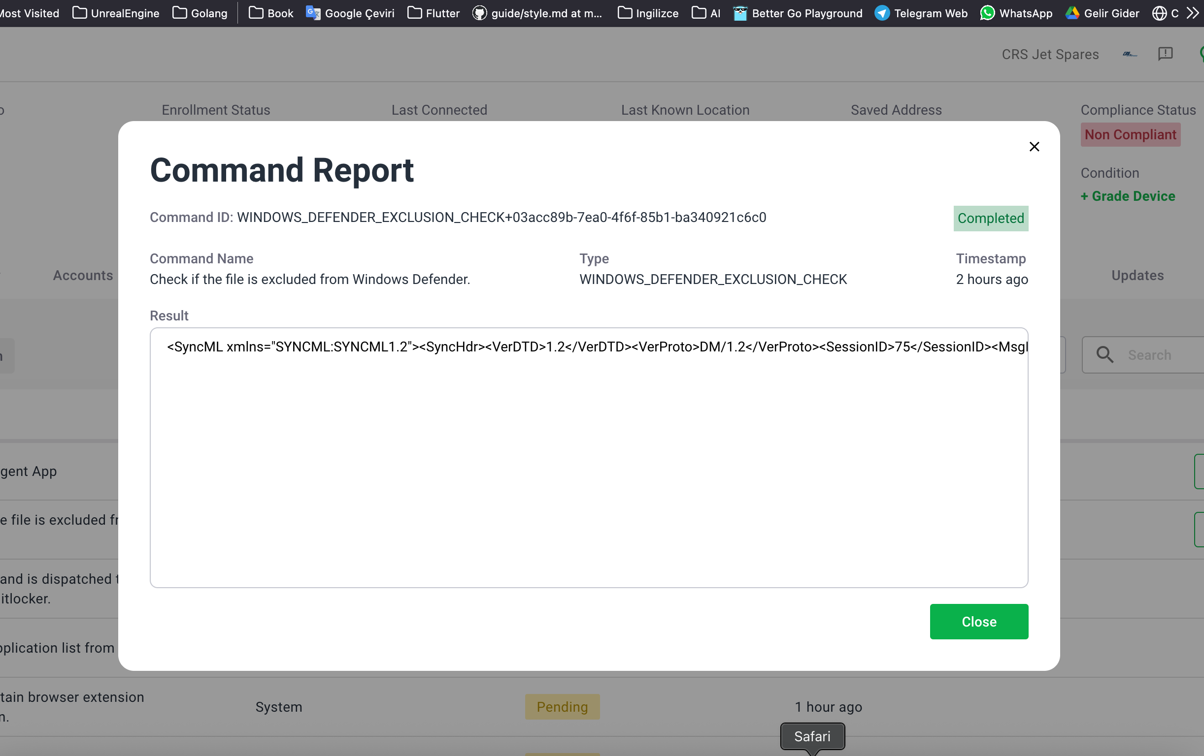 Routine Check Command: As part of routine checks, the command "WINDOWS_DEFENDER_EXCLUSION_CHECK" retrieves the currently added processes and paths in Defender from the device. If specific paths or processes are missing, it adds them and sends the updated configuration back to the device. This is done for all Windows devices.