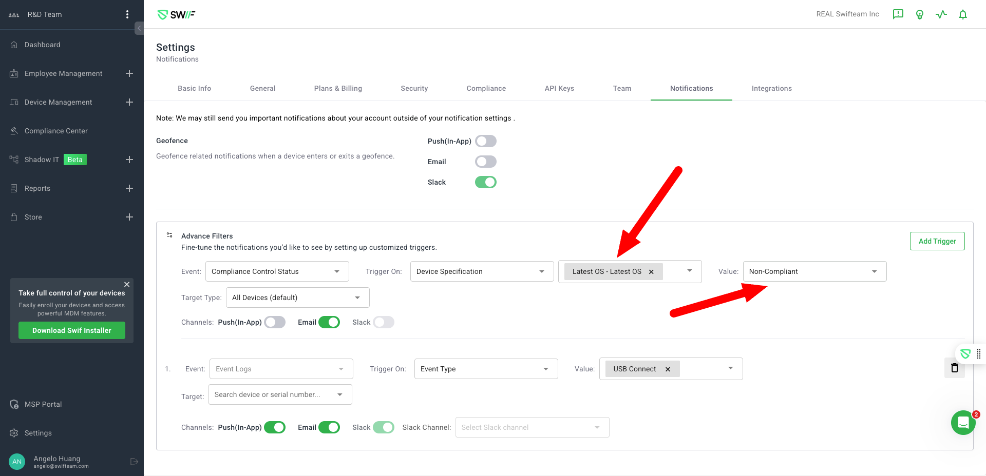 Notification Channels: Select from multiple notification channels including Push, Email, and Slack. Users can also choose specific Slack channels for notifications.