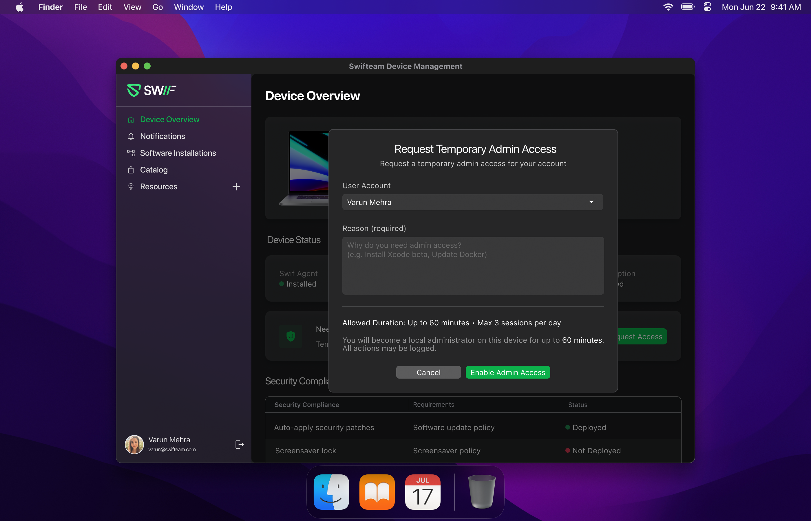 We’ve added a new end‑user flow in the Swif DeskApp that lets eligible users temporarily elevate themselves to local admin on their own device, based on the Temporary Admin Access policy configured in the Swif web app.