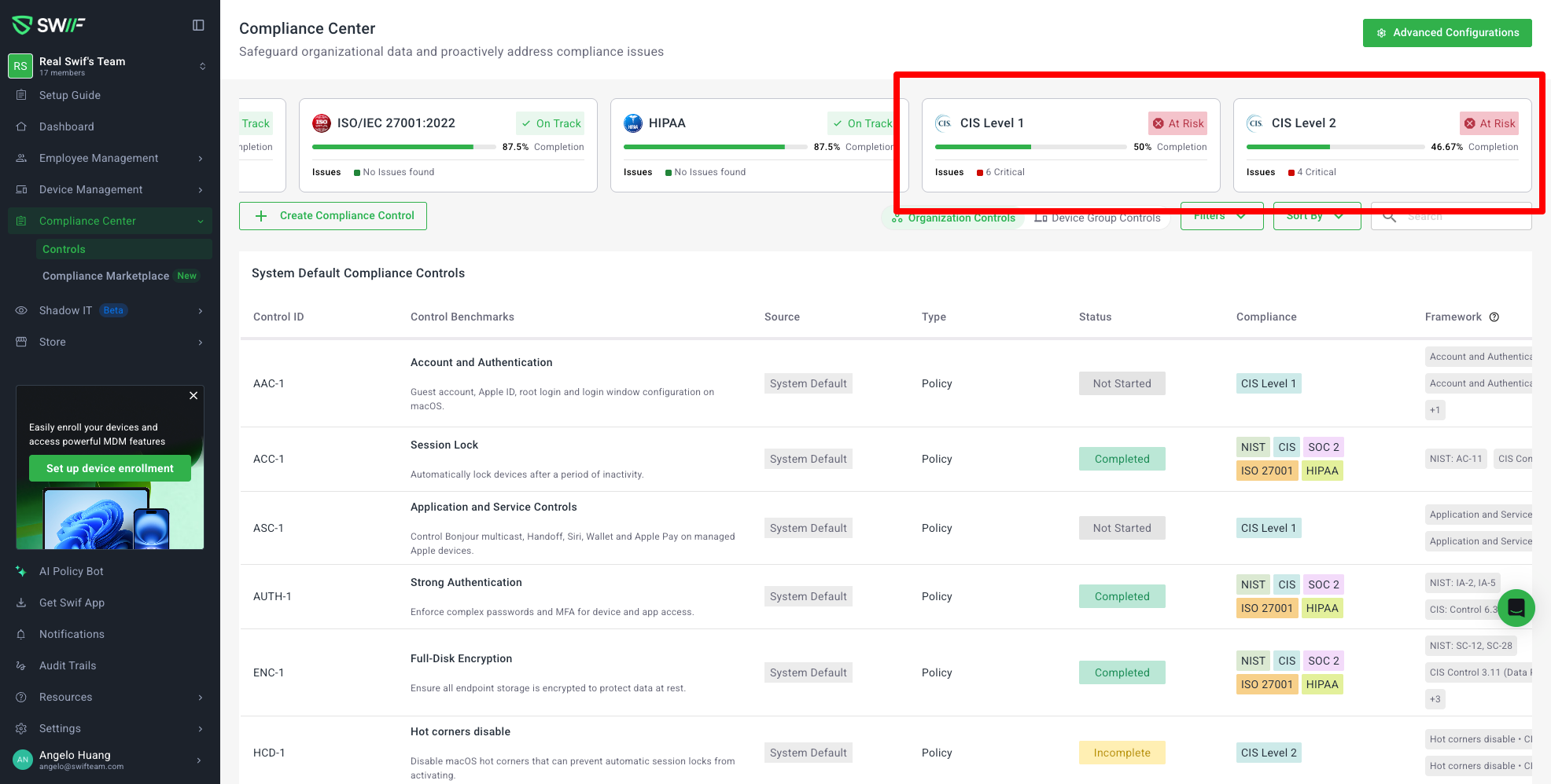 CIS framework details section: Compliance Center Overview | Help Center | Swif.ai