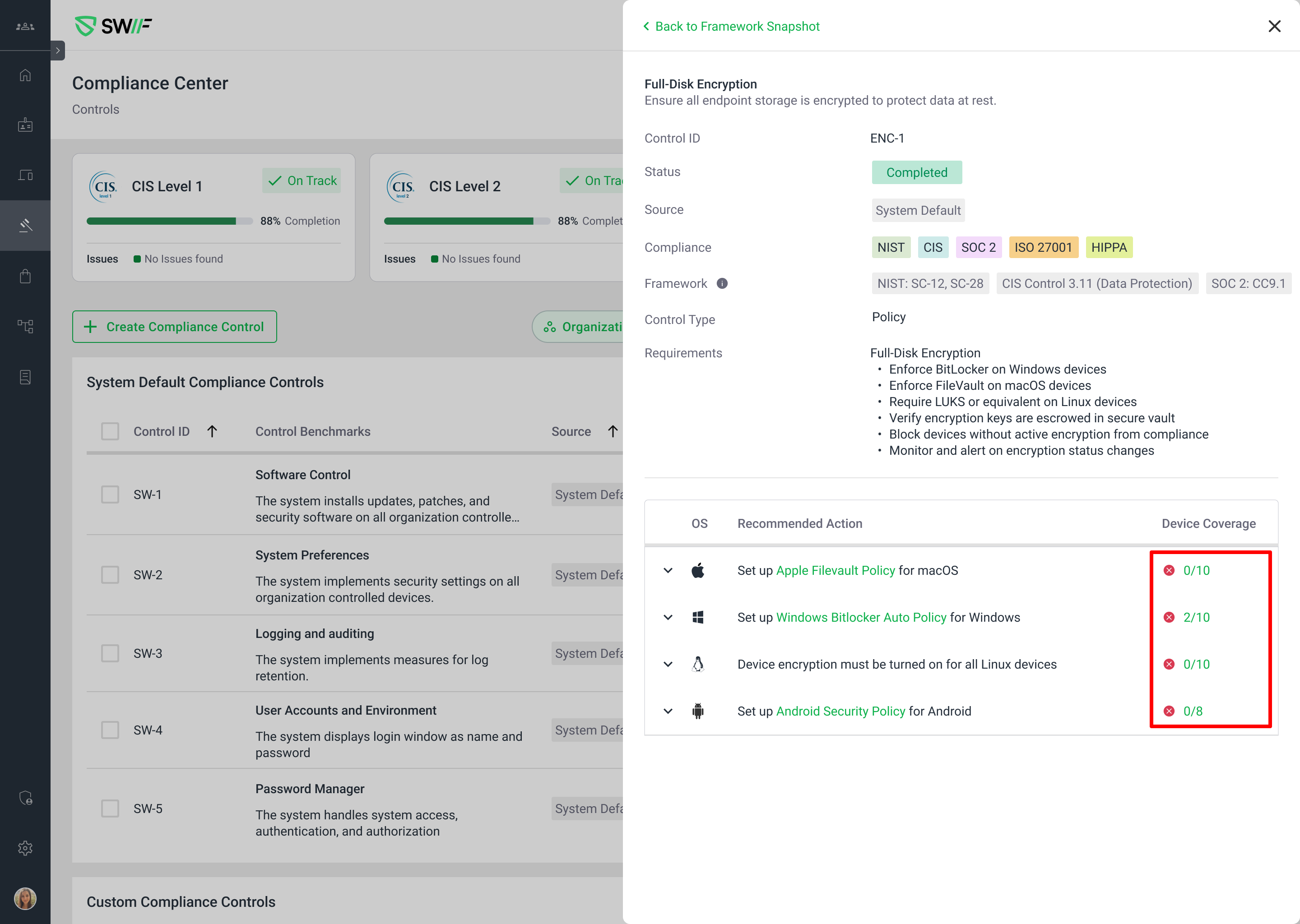 You can now click any highlighted control in Framework Snapshot to open a detailed Control Overview panel, showing control description, status, frameworks, and OS‑specific recommended actions.