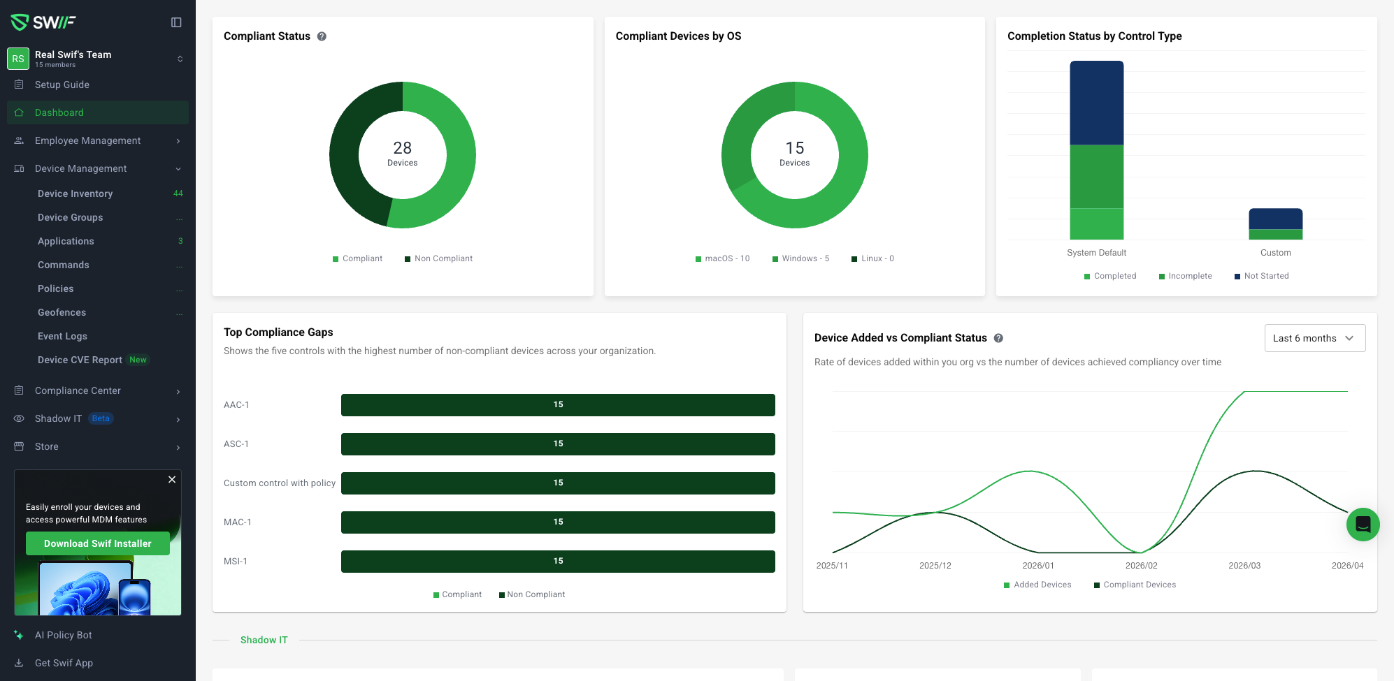 Top Compliance Gaps (new horizontal stacked bar showing the five controls with the most non‑compliant devices)