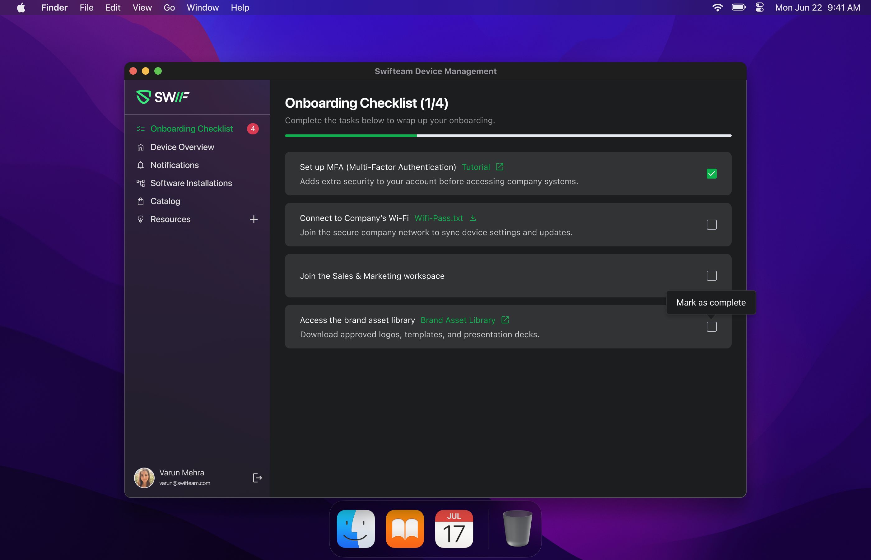 We’ve added a new IT onboarding experience to the Swif Desktop App so new hires can see and complete their onboarding checklist without signing into Swif.