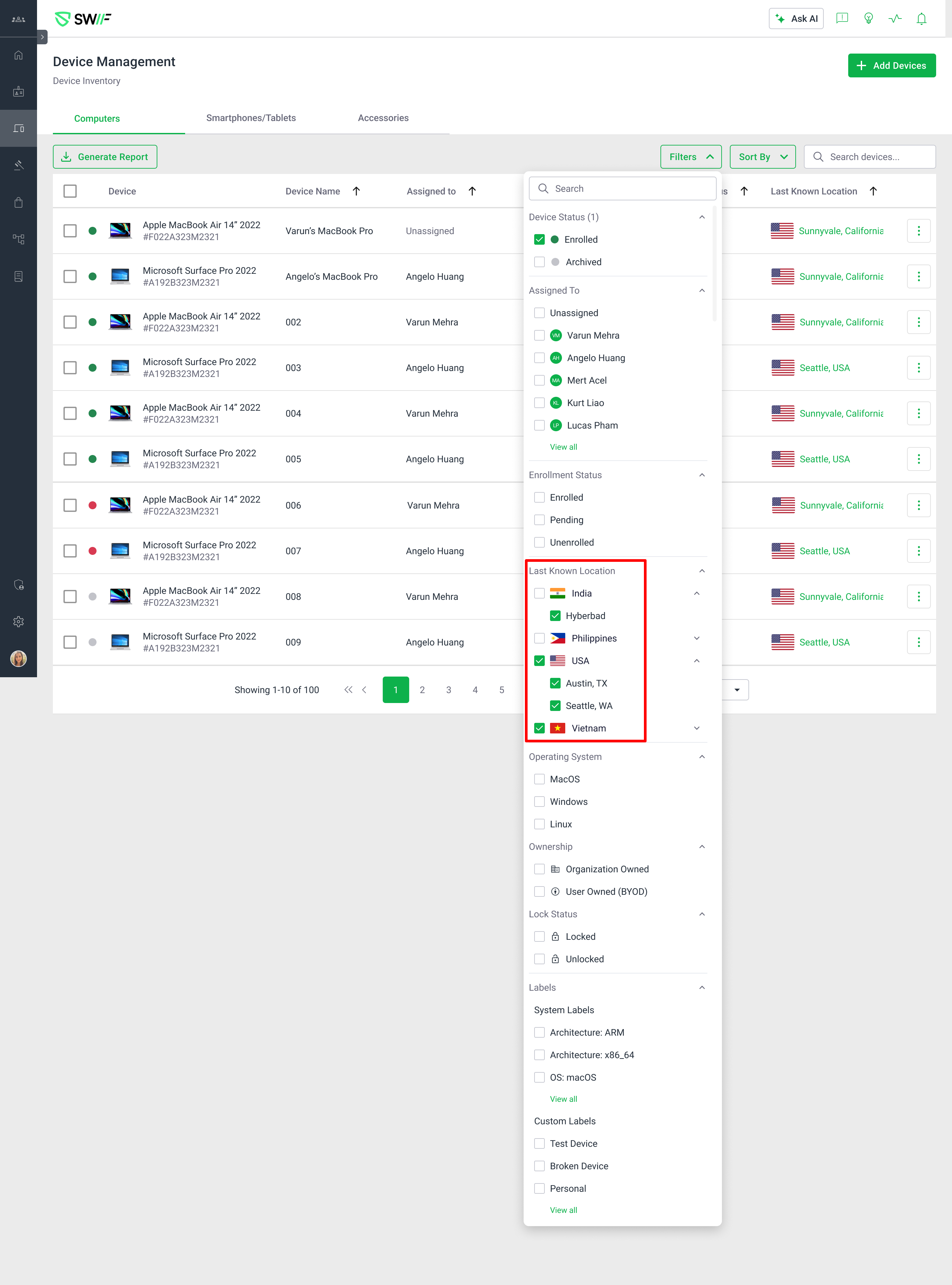 Filter devices by country and/or city based on their last known location.