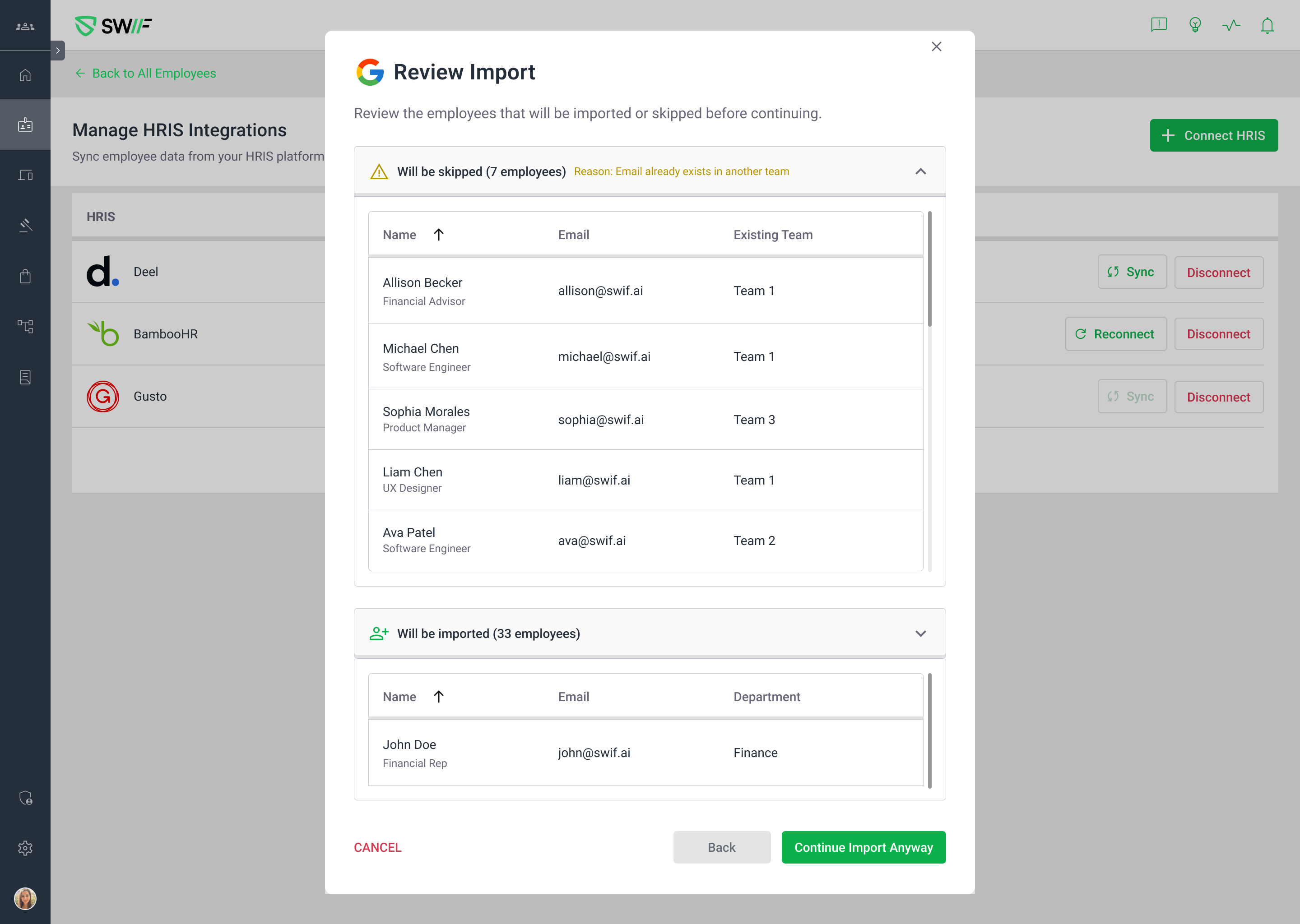 When importing employees via CSV or HRIS, you’ll now see a Review import modal whenever any email address already exists in another team.
