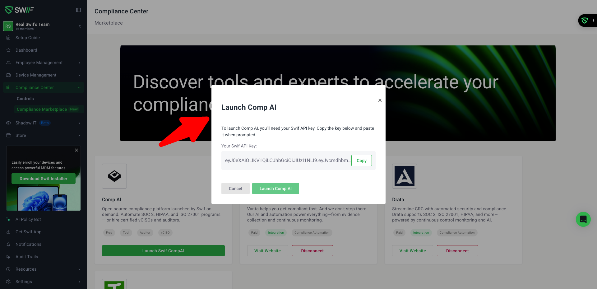 • The existing onboarding popup (showing your Swif API key, Copy button, and Launch COMP button) continues to work exactly as before.