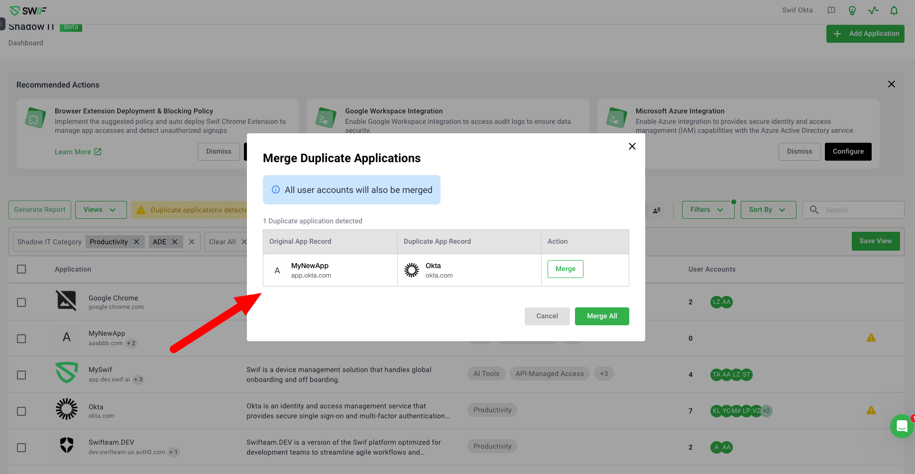 Merging Shadow IT Apps with Different Domains: Admins can merge multiple Shadow IT apps, even if they have different domains (e.g., app.hubspot.com and hubspot.com). During the merge, the admin selects which app will be the primary one, and the merged app will include all domains from the original apps.