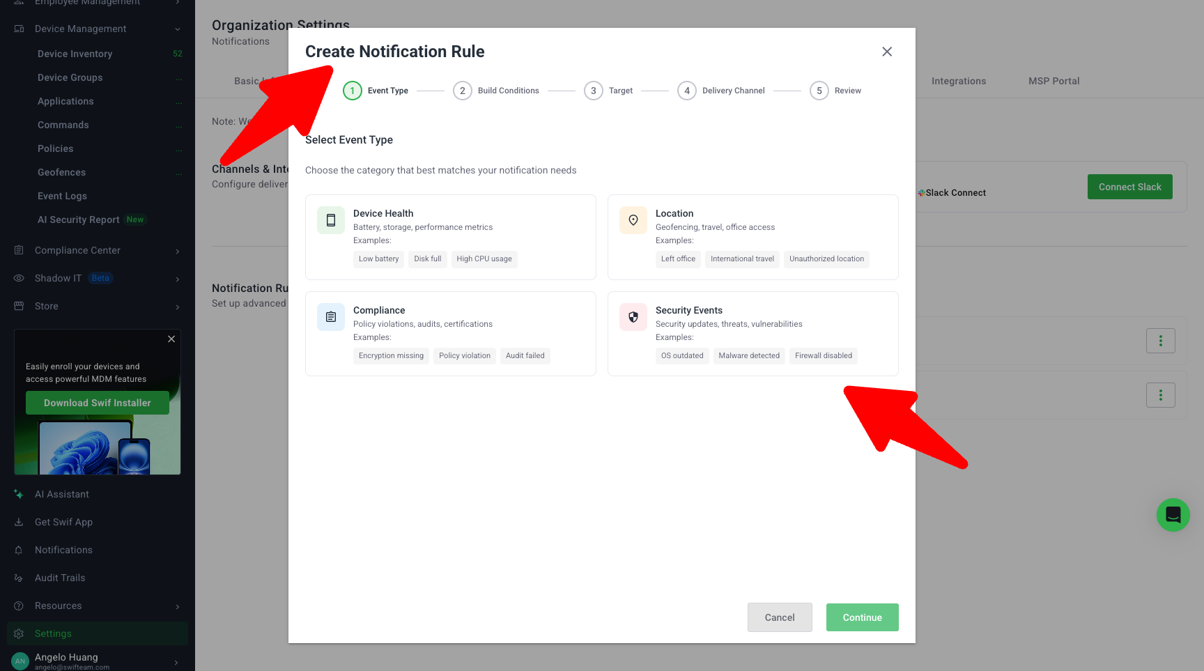 Clearer grouping of notification rules by type (e.g. Device Health, Location, Security, Compliance).