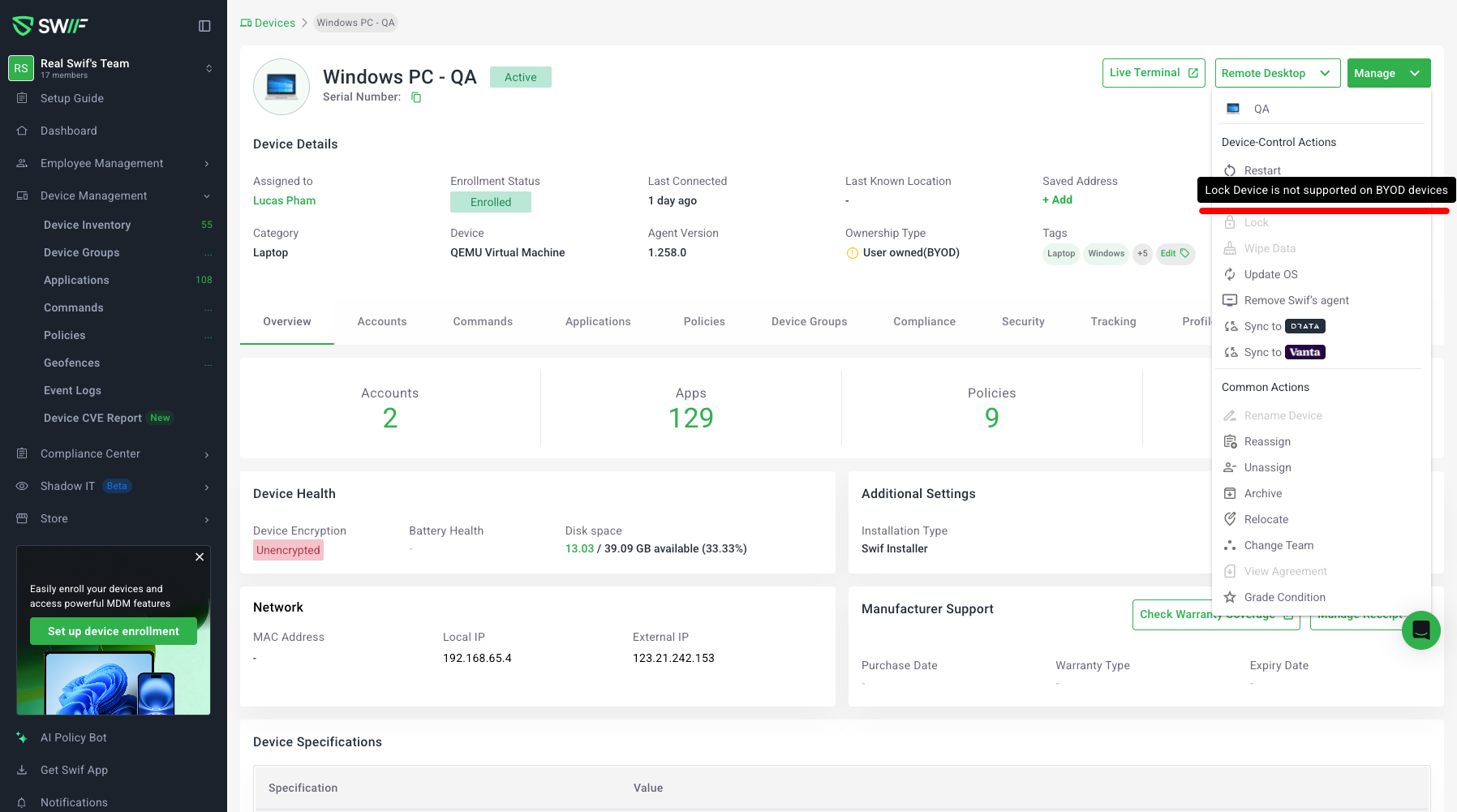 We’ve tightened how Swif handles certain high‑impact MDM actions on Windows BYOD (Bring Your Own Device) machines to make limitations clearer and prevent confusing failures.