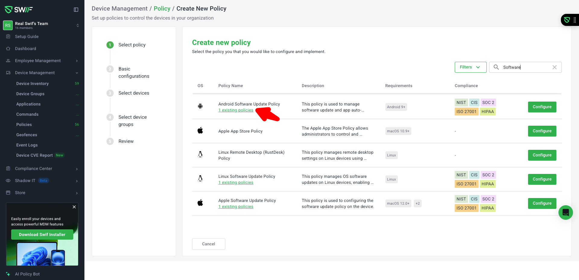 When creating a new policy in Swif, admins can now immediately see which policy types are already in use and quickly inspect existing configurations.