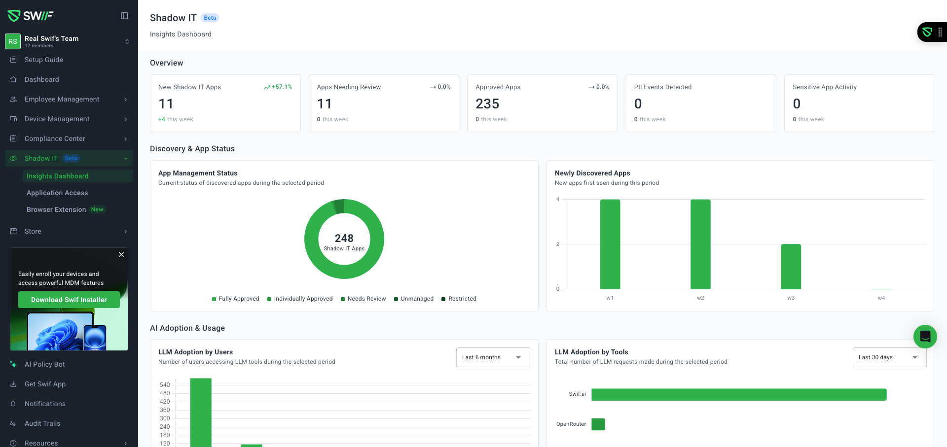Shadow IT – Insights Dashboard & LLM usage widgets