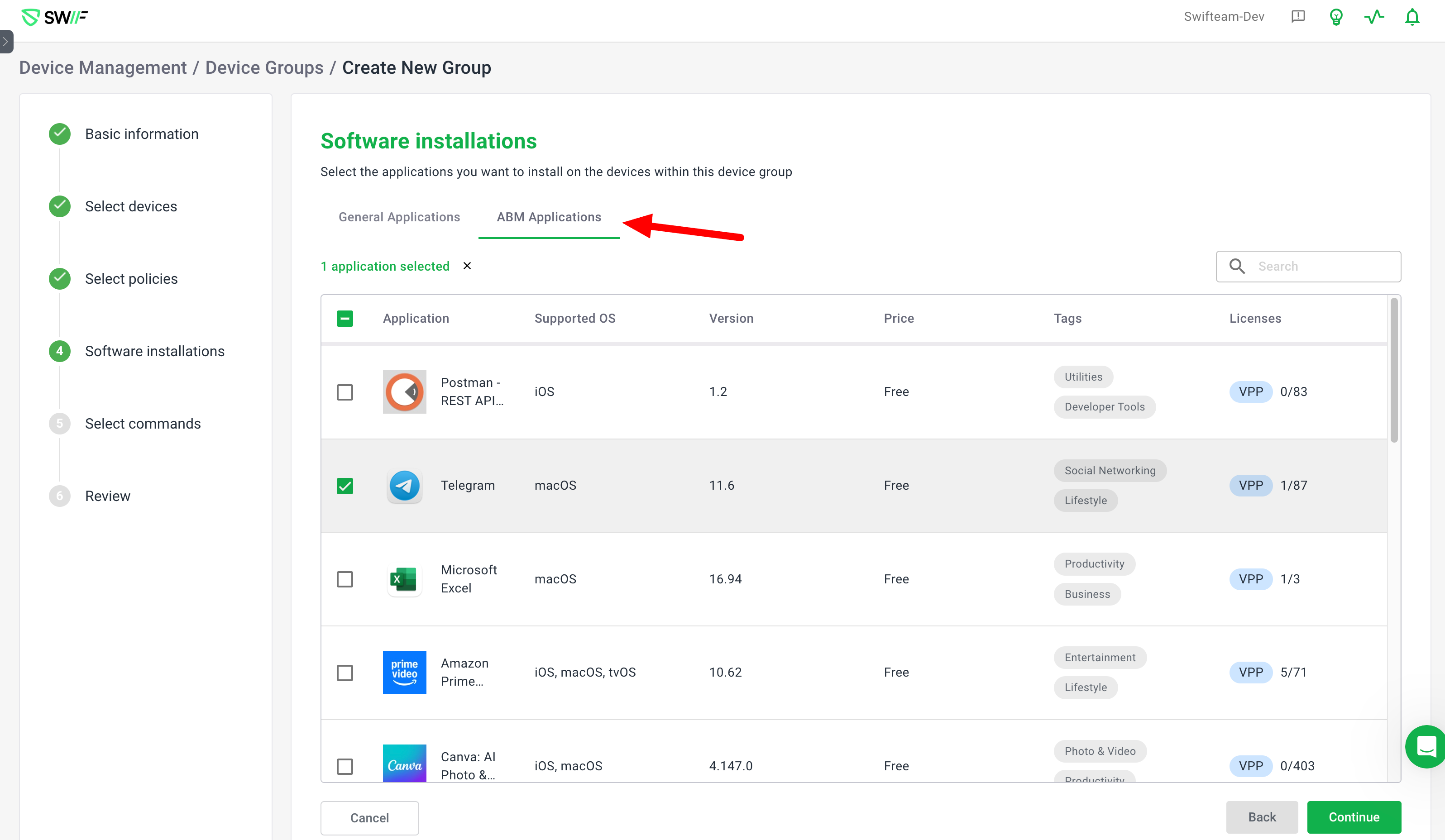 User Interface Enhancements: The application selection process now includes separate tabs for General Applications and ABM (Apple Business Manager) Applications, making it easier to navigate and select the appropriate apps.