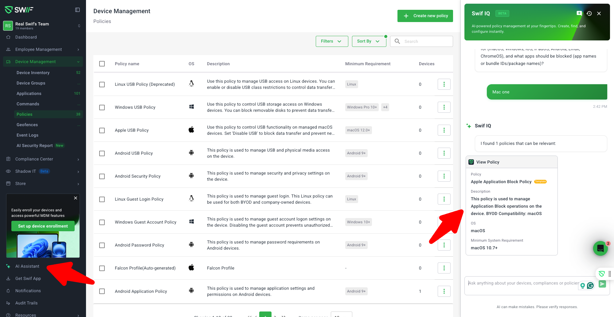 We’ve introduced SwifIQ Policy Bot, an AI‑assisted chatbot embedded directly in the Swif web app to help you understand and configure device policies using natural language, without leaving the page you’re on.