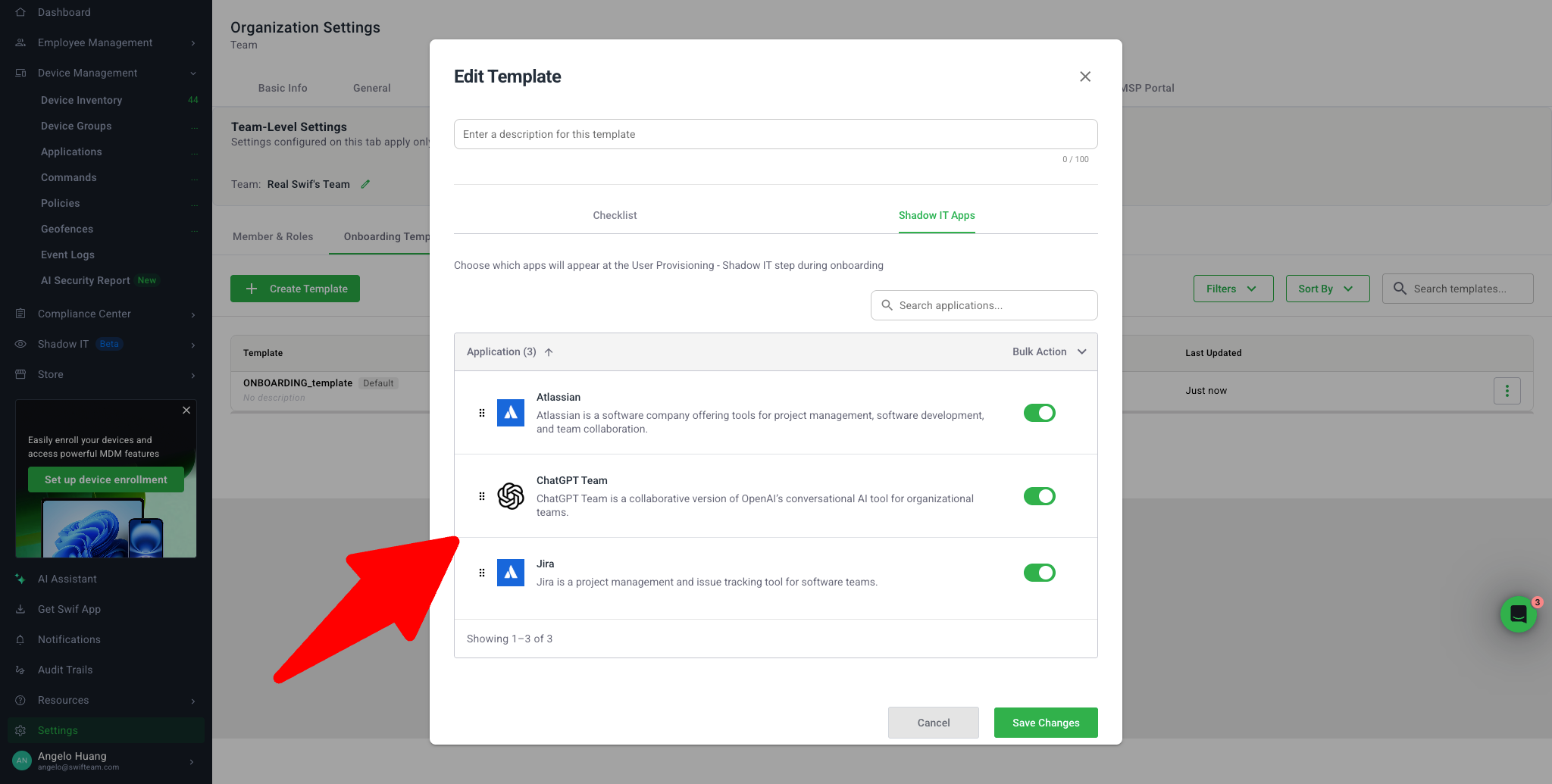 Settings → Team → Onboarding Templates → Shadow IT / Applications tab